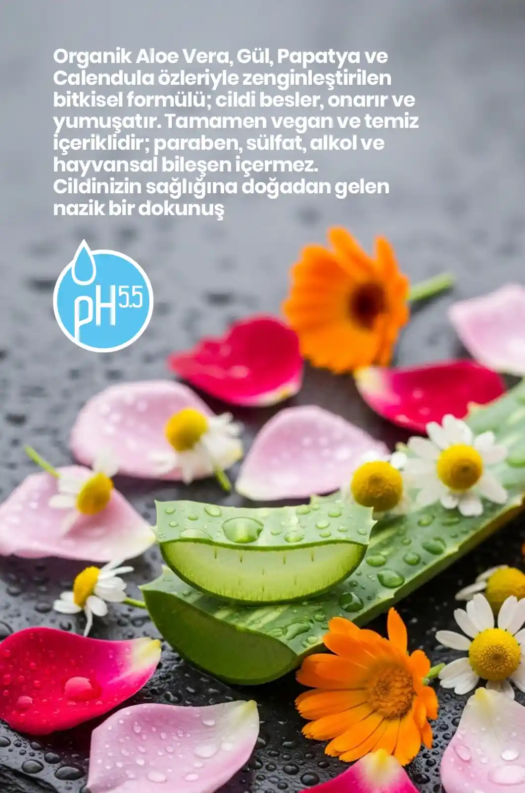 Organik Aloe Vera, Gül, Calendula (Aynısafa) ve Papatya özleri bir araya gelerek ciltte ferahlık, yumuşaklık ve yenilenme hissi yaratır.