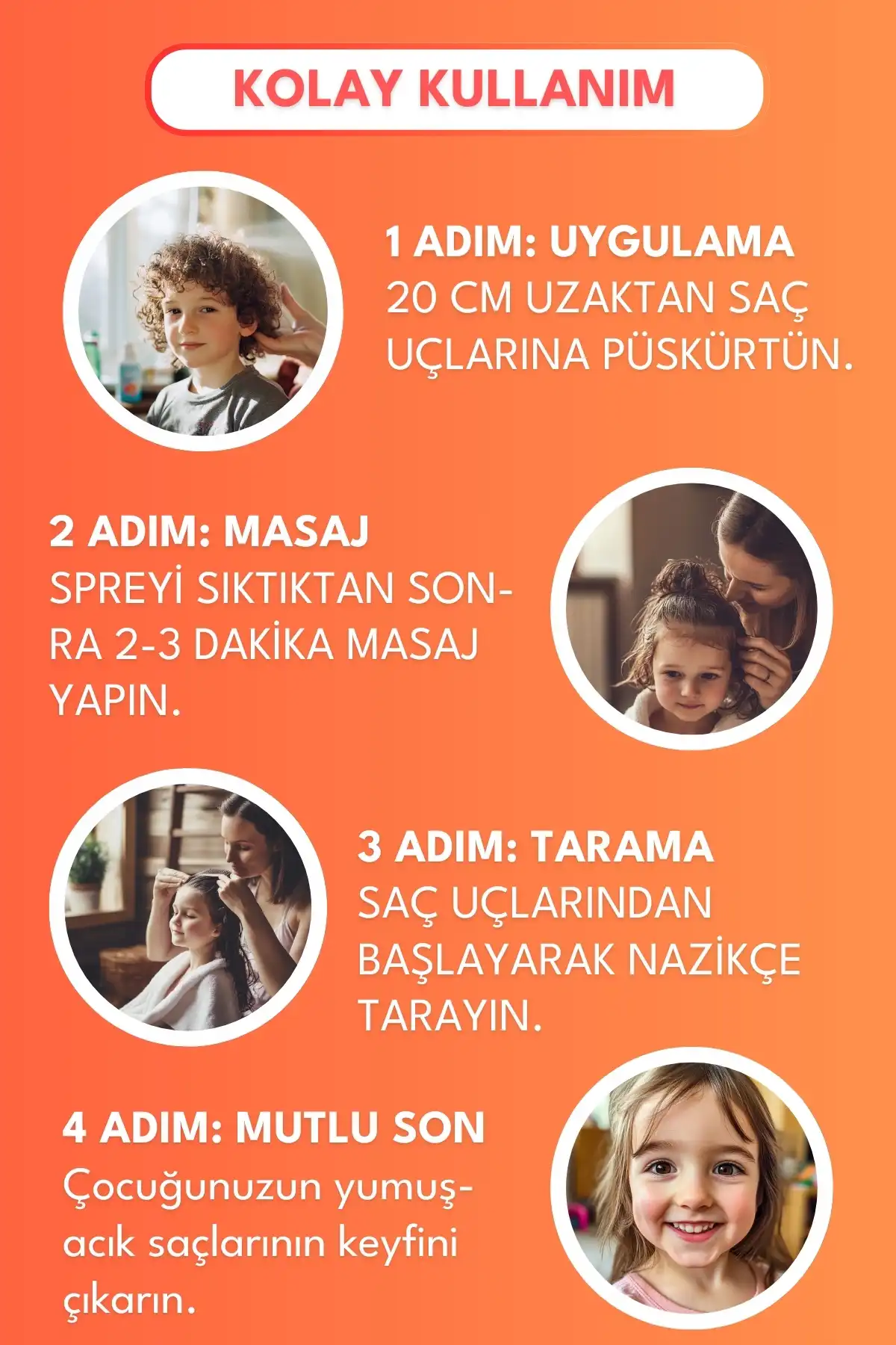 Minoris Kids Organik Kolay Tarama Saç Spreyi Kullanımı: Islak ya da kuru saça uygulama yapılabilir. Ürünü kullanmadan önce çalkalayın, taramaya hazır saça uygulayın ve nazikçe tarayın. Durulama gerektirmez. İstenilen sıklıkta kullanıma uygundur.